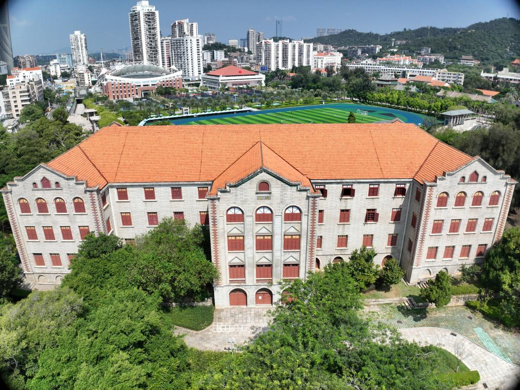 南侨十六1958年12月建成,体量最大,为四层横排式、中部前后双廊建筑,总面阔74.9米,进深26.4米,西端地势较低加建负一层,两端为正、背凸出的双层纵向角楼,作为图书馆。