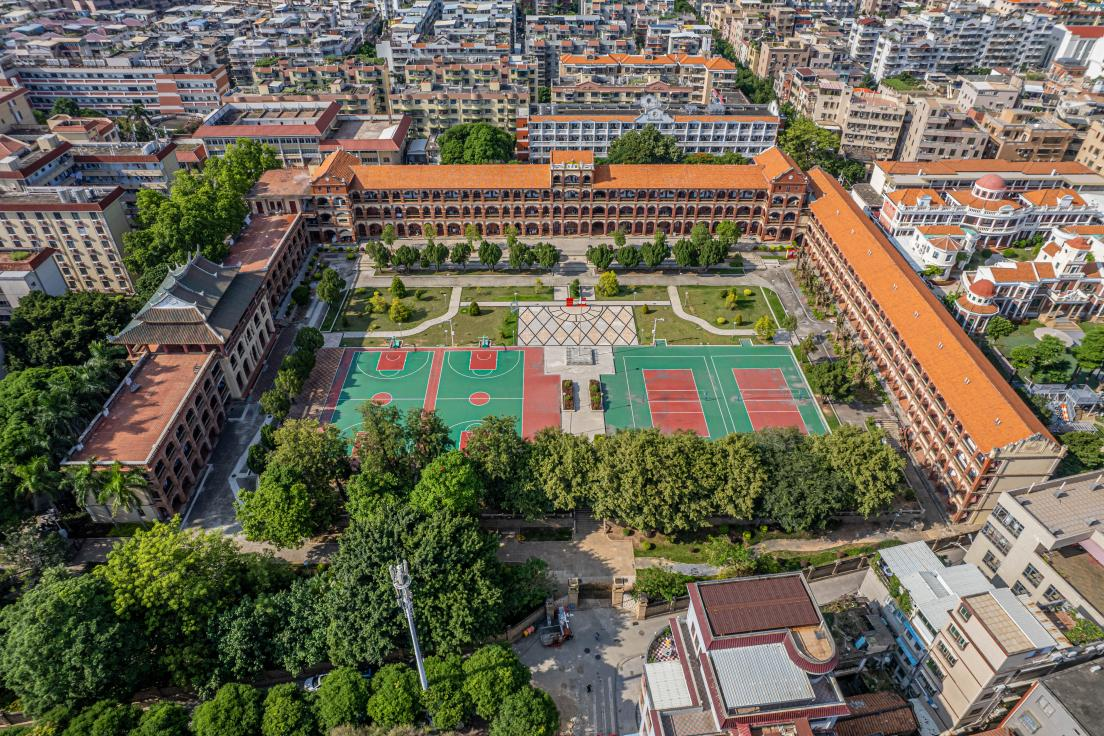 南侨十五1957年建成,平面布局与南侨十四基本相同,面宽38米,进深19.6米,四楼护栏有“南侨十五”楼匾,为教学楼。